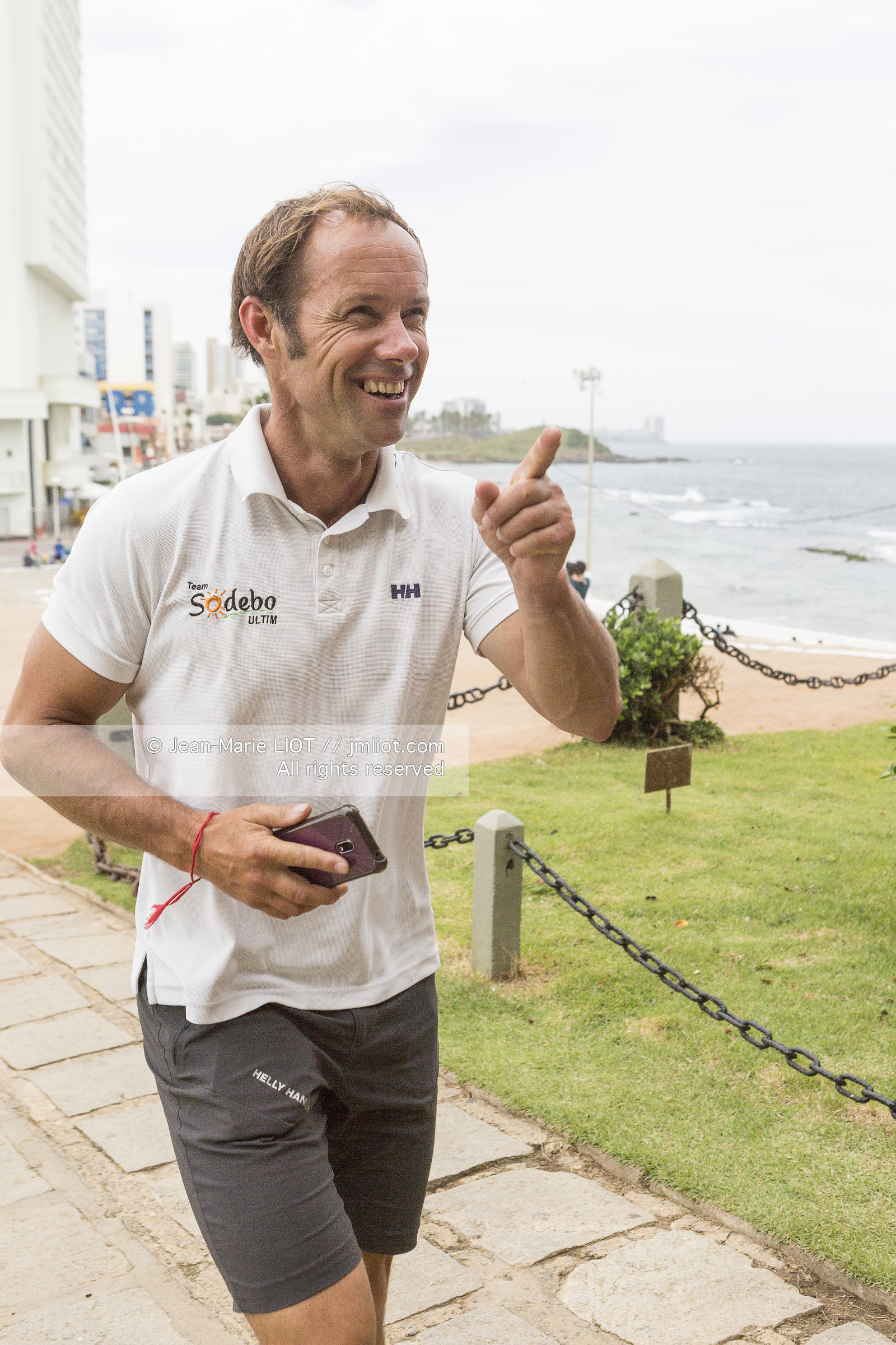 | Description | Rencontre avec Thomas Coville, skipper de Sodebo Ultim, vainqueur de la Transat Jacques Vabre 2017 avec Jean-Luc Nélias, pour le Journal du Nautisme avec le journaliste Frederic Pelatan, au phare de la Barra, Salvador de Bahia (BRA), le 14 novembre, 2017 - Photo Jean-Marie Liot - www.jmliot.com. |